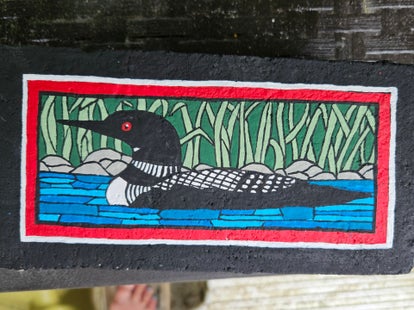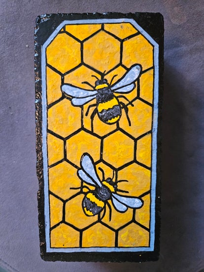 Each repurposed patio paver is hand-painted by the artist and then spray coated with a gloss sealer to ensure that they can be displayed both inside and outside. It is recommended that they be covered or brought inside over the winter.