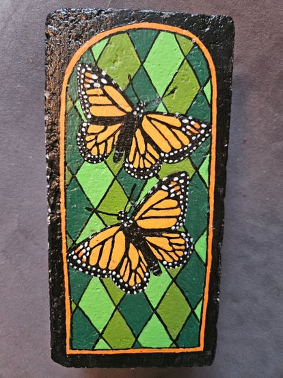 The two monarch butterflies ate set against a stained glass window made of green diamonds.