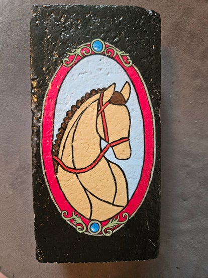 Stylized light brown horse's head with brown mane against a blue background with a red frame. Side panels show a horseshoe with red roses.