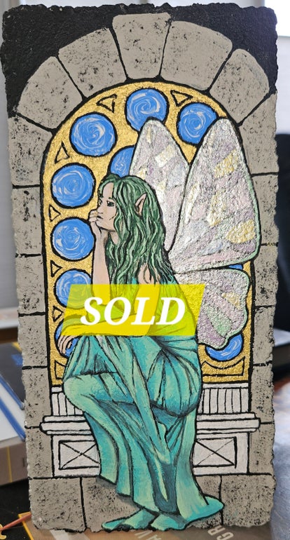 This gorgeous fairy is sitting in a golden window with blue swirled panes, her green dress pooled below her.