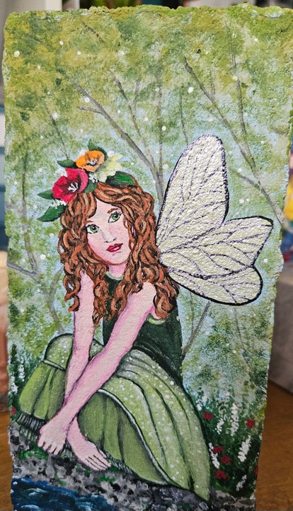 This curly haired fairy is taking a break beside a rushing creek. She would look gorgeous in your garden. The sides are painted to continue the enchanted forest background.