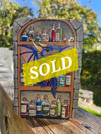 This mischievous blue dragon has found his way onto the apothecary shelf. Let's hope he doesn't knock those bottles of spell ingredients down!