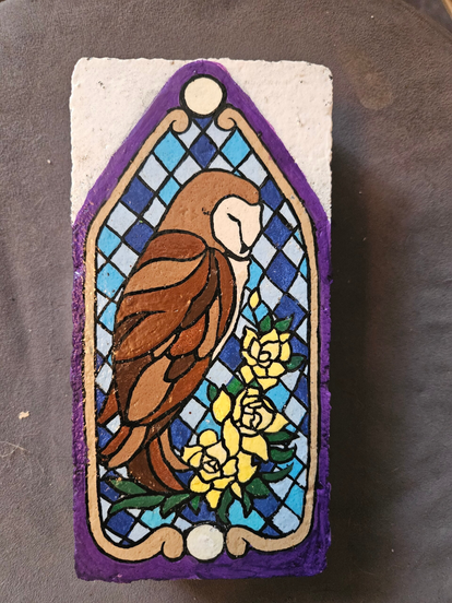 This sleepy barn owl is styled against a stained glass window made of blue diamonds and accompanied by pretty yellow flowers.